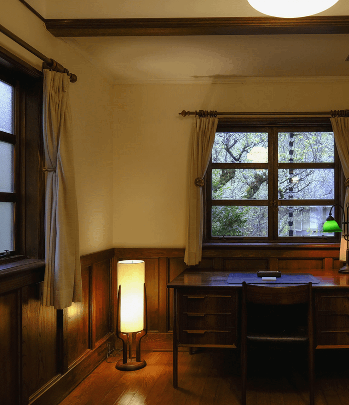 2名から4名で滞在いただける離れ。森の気配が寄り添い窓から顔出す。何も足さず、何も削らず、ただそこにある美しさとともに時を重ねる。