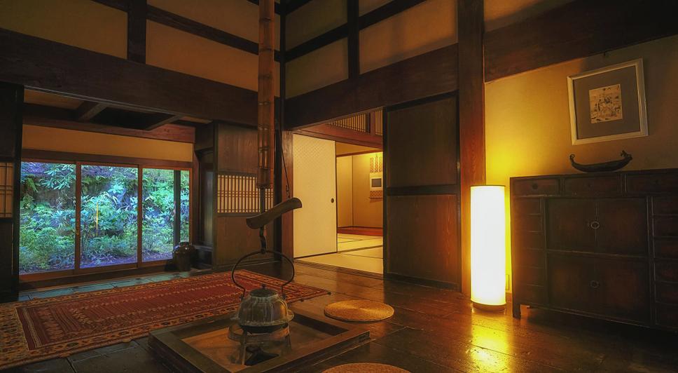 44坪(145平米)の和洋室タイプ。8帖洋室リビング、10帖和囲炉裏の間、10帖と6帖の和室、そして2階の8帖ベッドルームが、2〜6名様までゆったりとご利用いただける多彩なゾーンを形成。古民家を移築した温かみある空間で、客室温泉が旅の疲れを癒す、贅沢なひとときをお楽しみください。